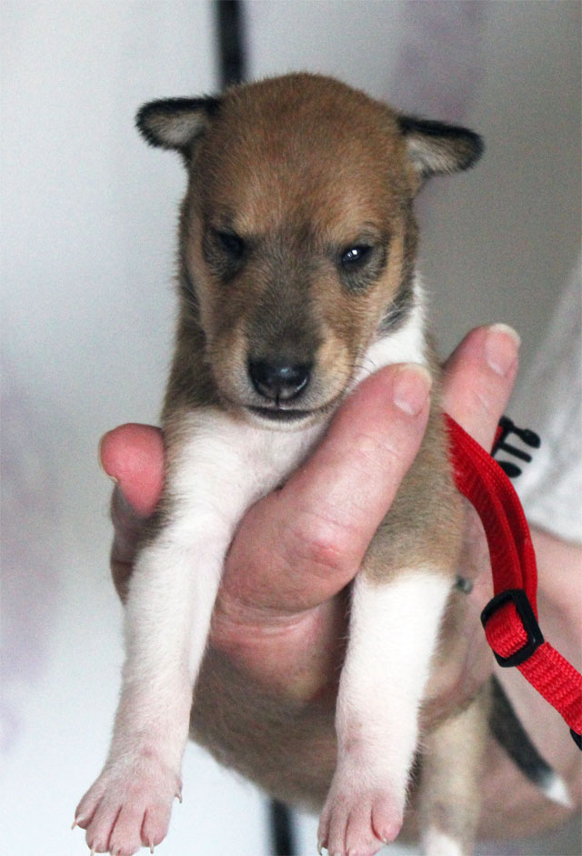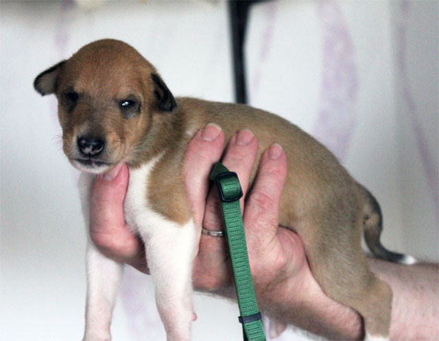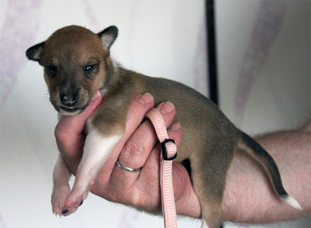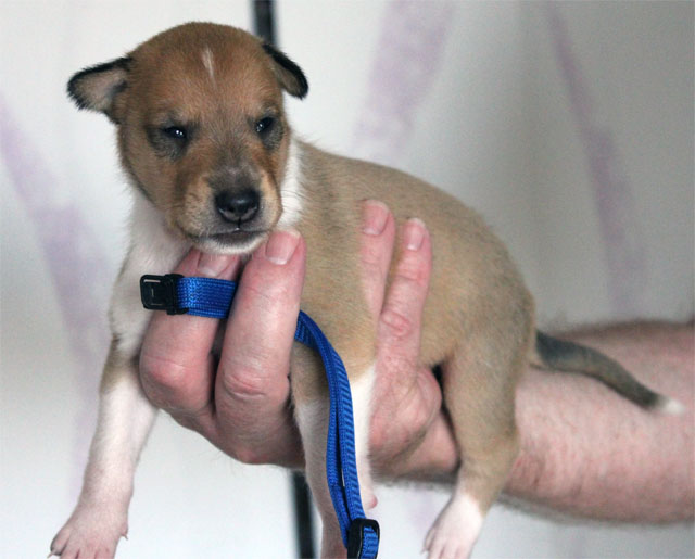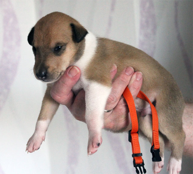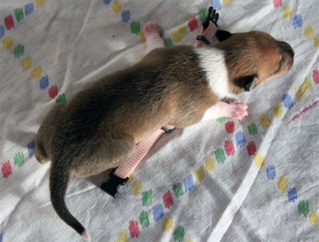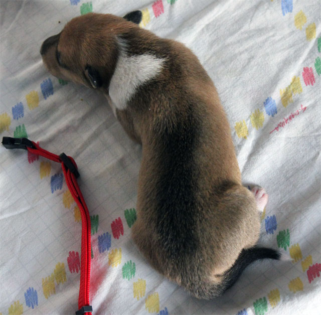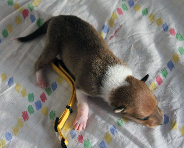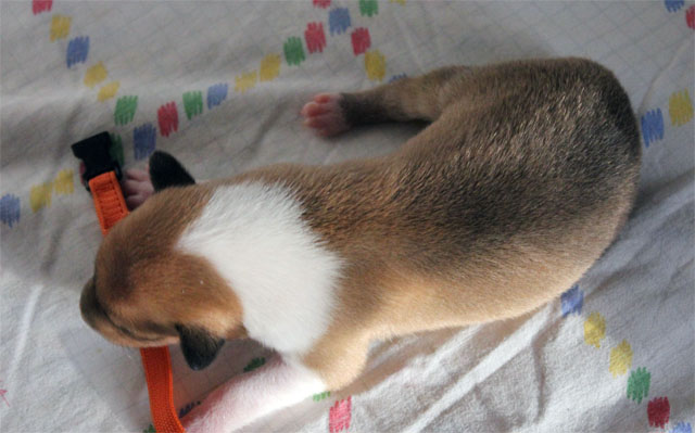 Damit die Welpen mit ihren neuen Besitzern gleich Gassi gehen können, ein Geschirr mit Leine