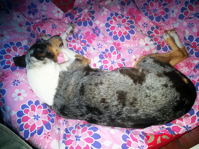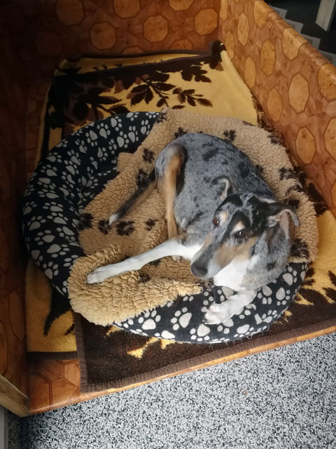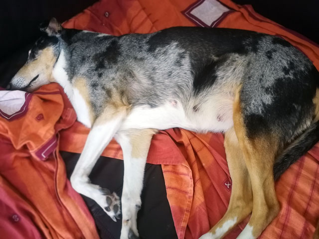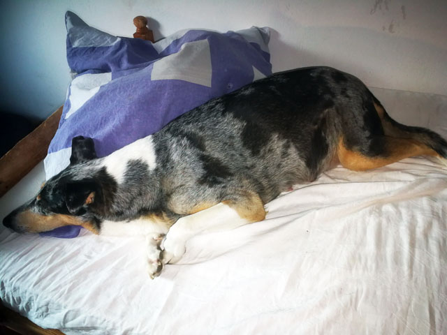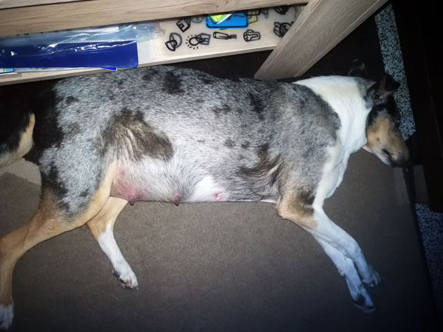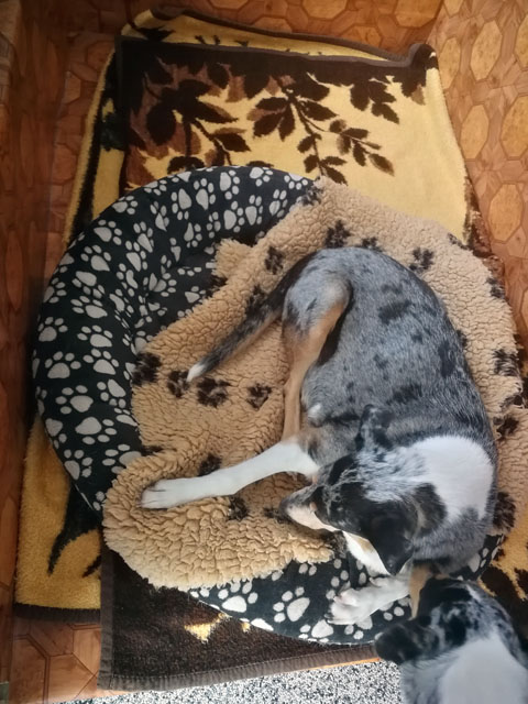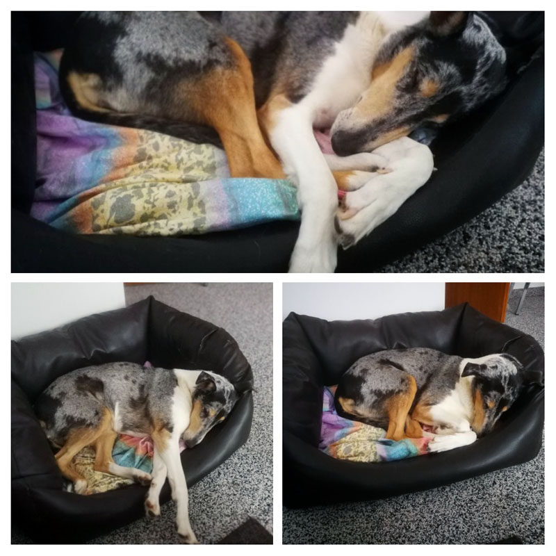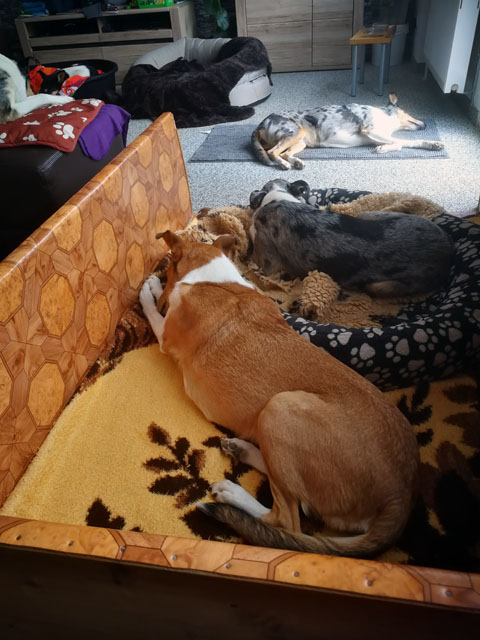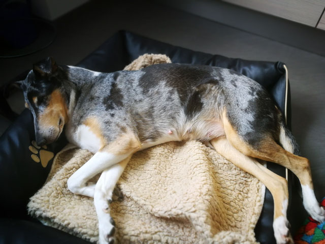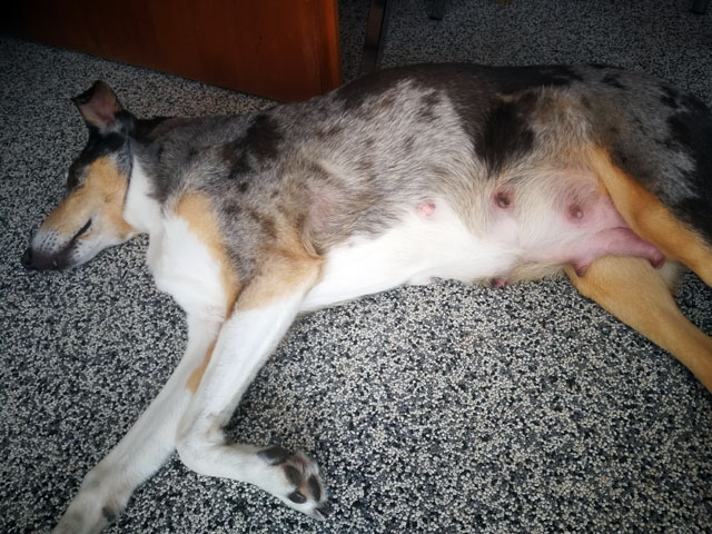 Irina geht es sehr gut. Auch das die Übelkeit hat sich mittlerweile gelegt und das Futter wird wieder bestens vertragen. Bei regnerischem Wetter gibt es nichts besseres al zu schlafen und Welpen brüten.