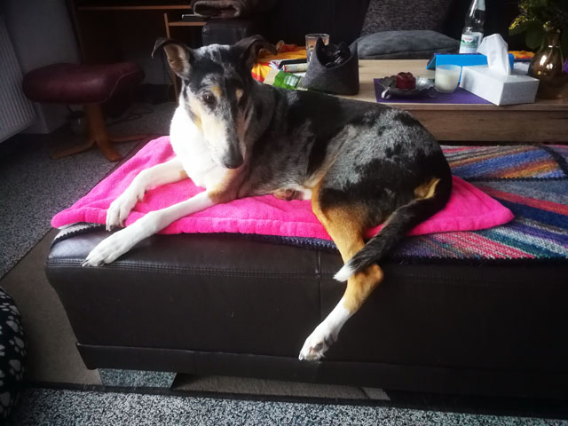 Irina lässt es sich gut gehen. Nach dem Fressen wird auf dem Sofa ausgeruht .