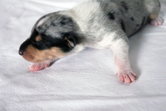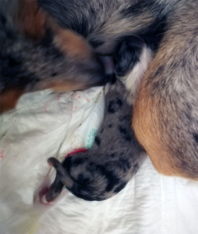 Für Smilla war das nicht gerade eine leichte Geburt. Denn der erste Rüde war schon ein kleines Schwergewicht. Er wog 368 Gramm ein blauer Rüde, dann beim zweiten Welpen denkt man das es geschafft ist und der Weg für die anderen Welpen gut vorbereitet ist. Aber nein, Smilla tat sich noch härter, denn der zweite Welpe war noch dicker. Ein Rüde der 396 Gramm wog. Die beiden anderen Welpen eine kleine Hündin und ein Rüde kamen dann mit einer Leichtigkeit auf die Welt. Smilla hat die Geburt gut weg gesteckt und kümmert sich super um ihre Welpen.