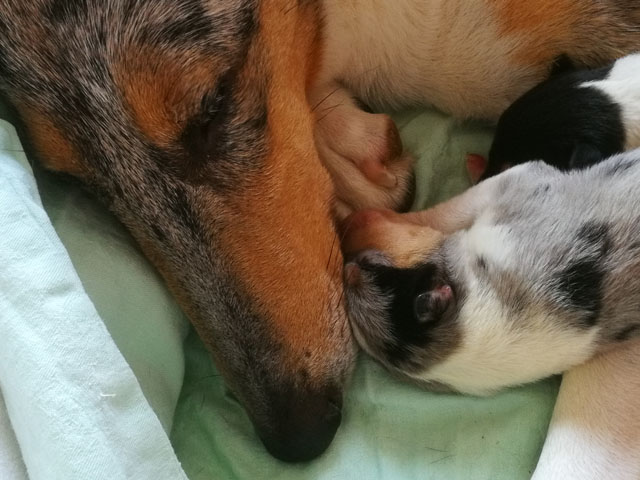 Beide Hündinnen säugen gemeinsam ihre Welpen. Smilla hat sogar 2 Welpen übernommen und lässt sie mit viel Geduld gemeinsam mit ihren drei Welpen trinken. Aber auch bei Blue Sky dürfen Smilla`s Welpen trinken. Sozusagen teilen sich nun die beiden die Arbeit. Es wird gemeinsam gekuschelt und