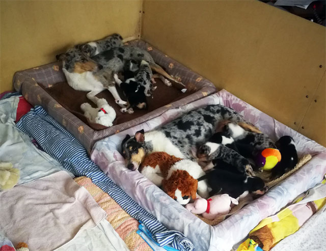 Smilla und Blue Sky versorgen gemeinsam fürsorglich ihre Welpen. Alle Welpen dürfen von jeder Mama mal trinken. Auch wird gemeinsam gekuschelt und die große Wäsche wird auch von beiden Mamas an allen Welpen vorgenommen. Die Mahlzeiten nehmen die 13 Kleinen gemeinsam zu sich. Allerdings haben wir 2 Fütterringe da dann das Gedränge nicht so ist. Alle Welpen haben sehr gut zugenommen. Ganz viele Bilder gibt es wieder in unserem Welpenblog