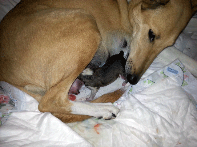 Brenda mit ihren Welpen kurz nach der Geburt.
