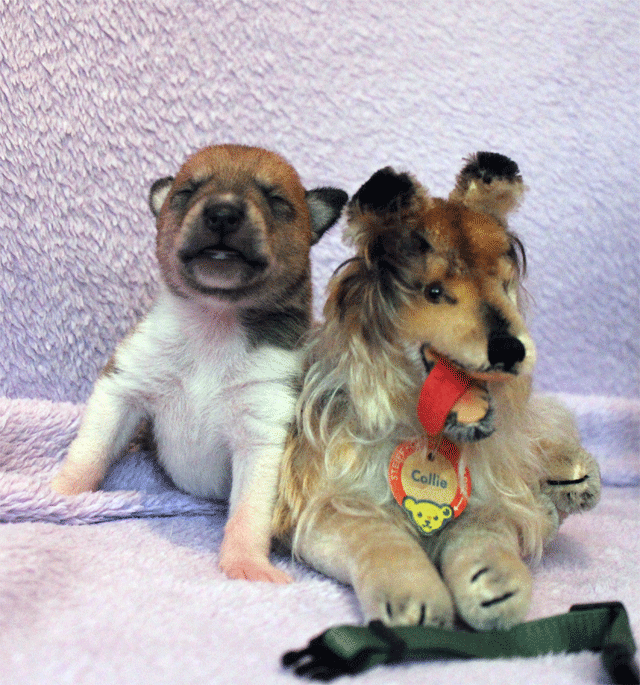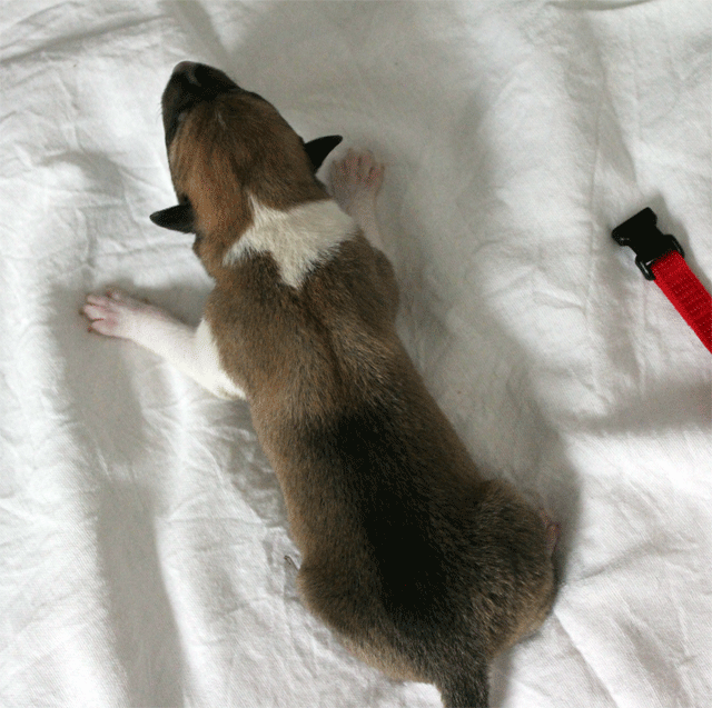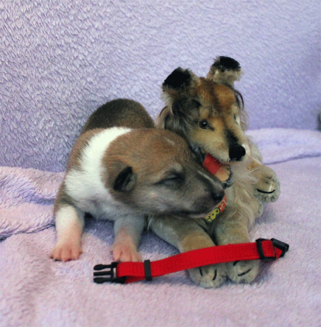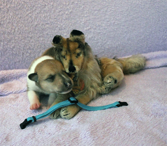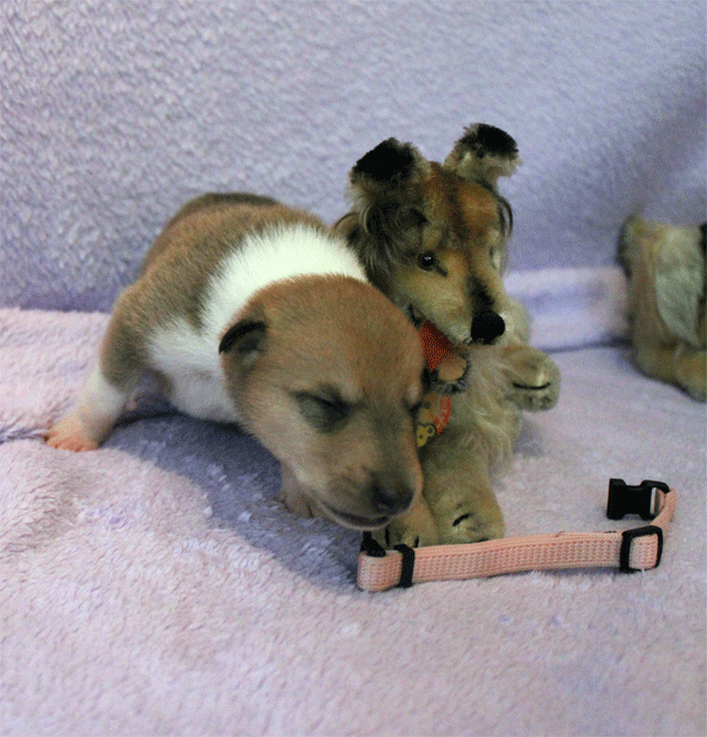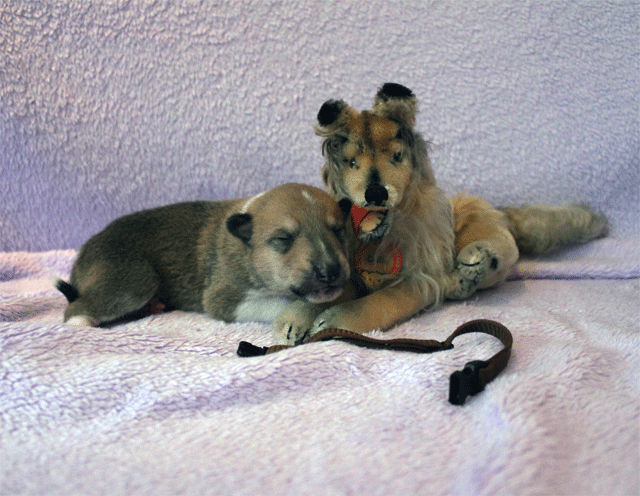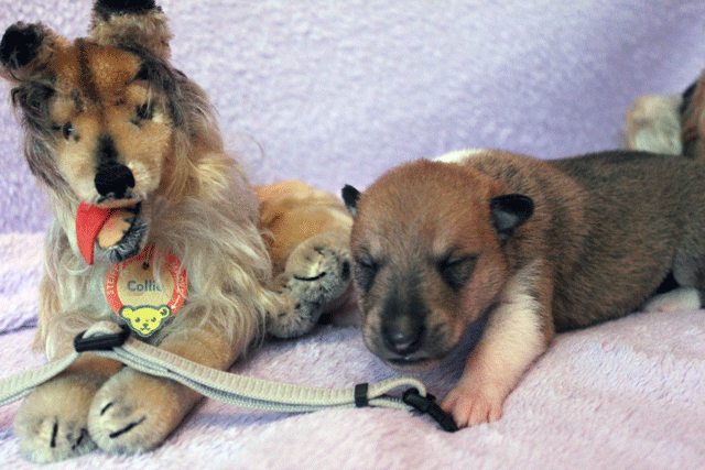 Welpe 1 Hündin sable geboren 04.17 Uhr, 308 gr. Halsband rot