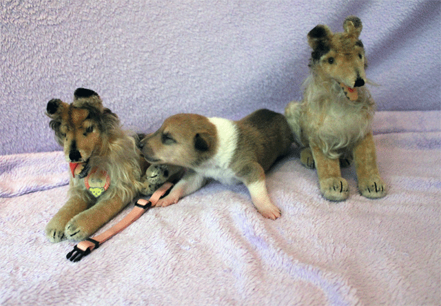 Welpe 2 Hündin sable geboren 04.40 Uhr, 326 gr. Halsband rosa