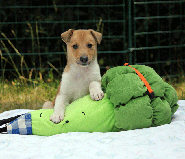 Die Zeit vergeht wieder wie im Flug. Täglich gehen die Welpen in den Garten. Leider ist es zur Zeit so heiß das die "Kleinen" über die Mittagszeit wieder ins Wohnzimmer in den Welpenauslauf müssen. Die erste Milchmahlzeit haben die Welpen auch schon hinter sich gebracht. Es wird viel gespielt und so gut wie alles ausprobiert. Man rennt durch den Tunnel, ins Zelt und über das Wackelbrett. Die "Tanten" sind eine gute Unterstützung für Brenda. Alle kümmern sich um die Purple Heart.