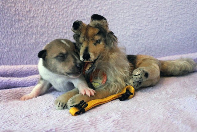 Die Purple Heart sind in ihren Welpenauslauf umgezogen. Dort haben Sie mehr Platz, es gibt jetzt fast jeden Tag neues Spielzeug. Die Spieluhr spielt auch schon täglich ihre Melodie. Mama Brenda umsorgt immer noch ganz lieb ihre Welpen. Sie hat noch viel Milch, so das die Welpen alle satt werden und auch zunehmen. Die ersten Zähnchenspitzen sind zu sehen und es wird miteinander gespielt.