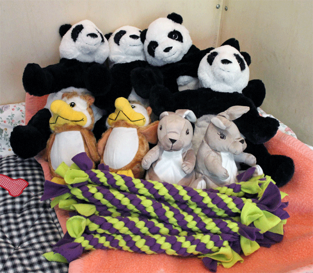 Als Abschiedsgeschenk gab es verschieden Stofftiere und ein selber gebasteltes Spielzeug ein: "scoubidou tug" ein Zerrspielzeug aus Fleece