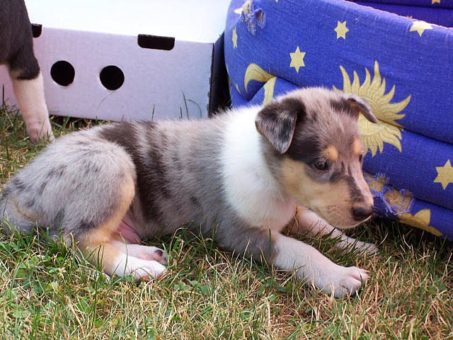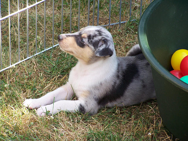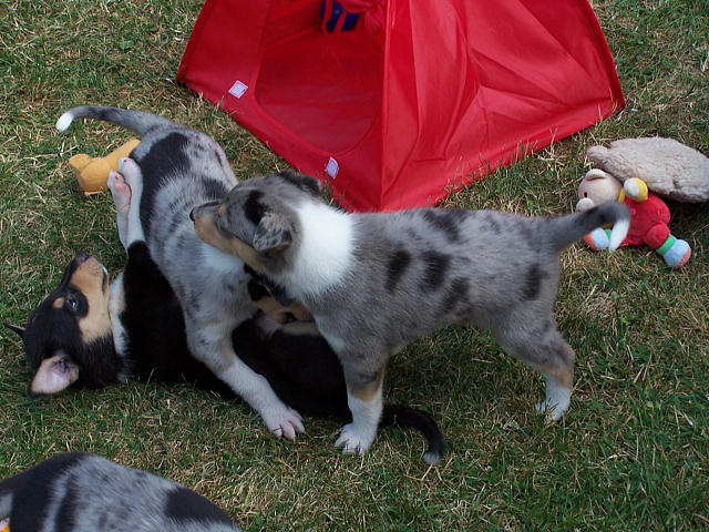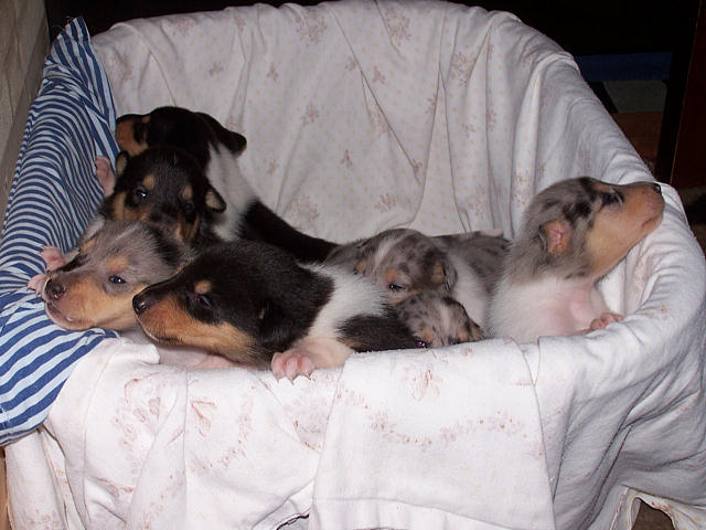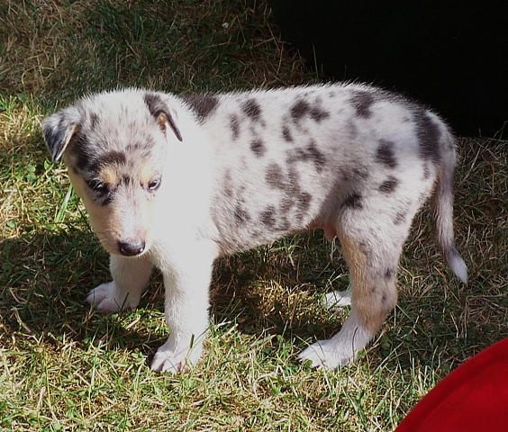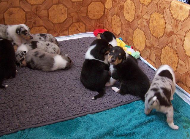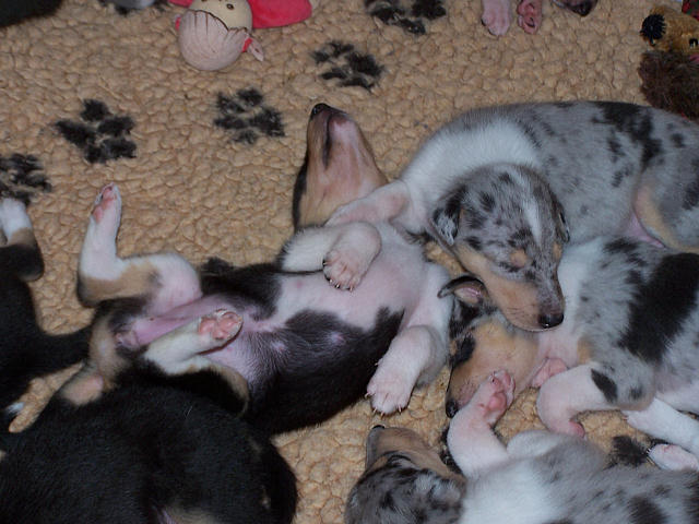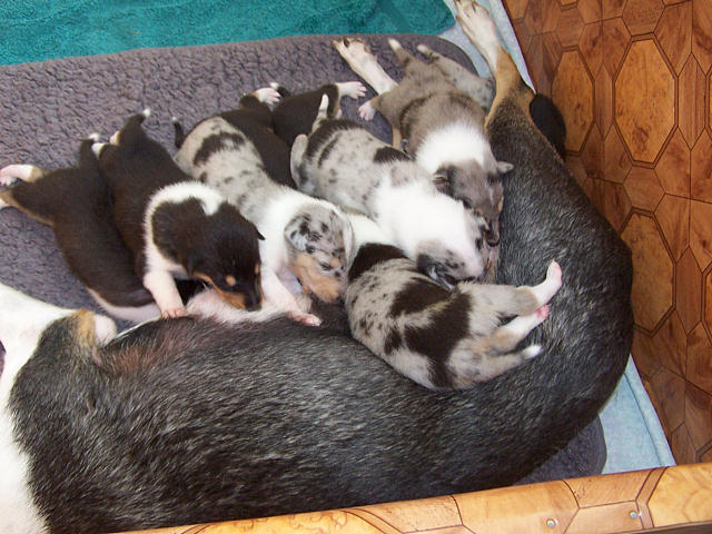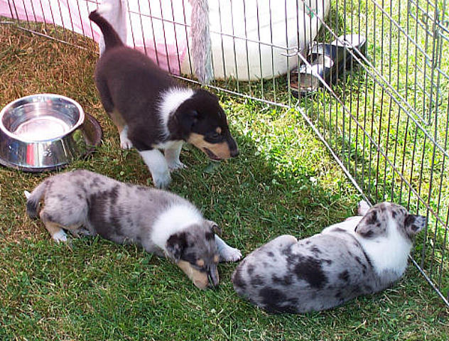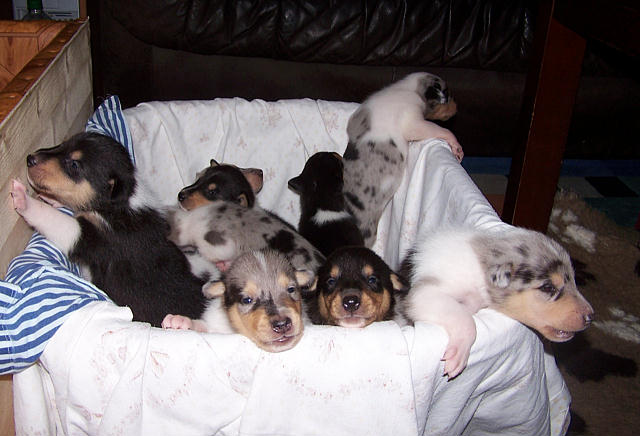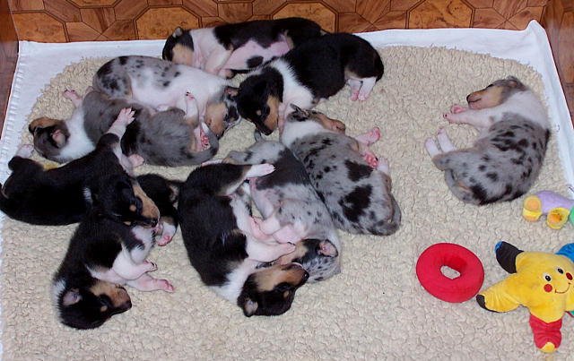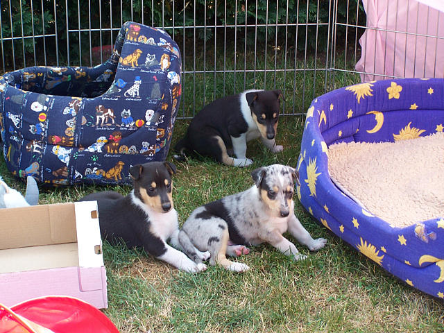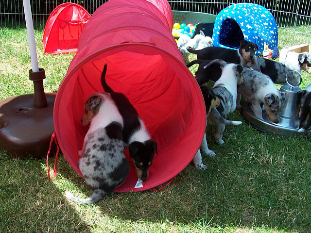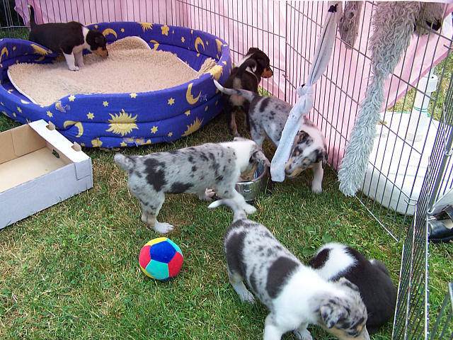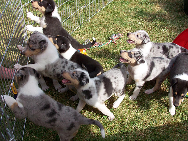 Es sind 5 blue-merle Rüden, 2 tricolour Rüden und 3 tricolour Hündinnen. |