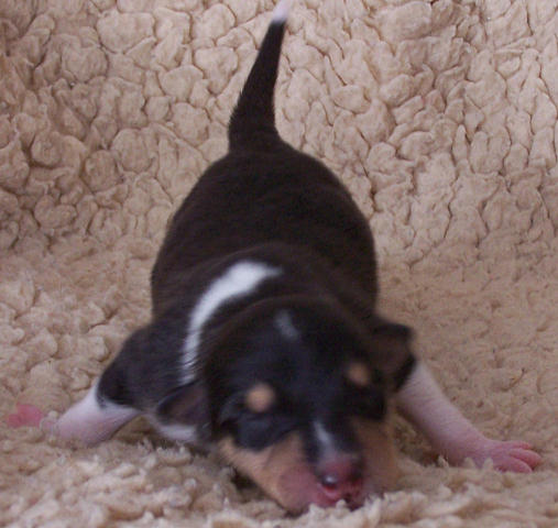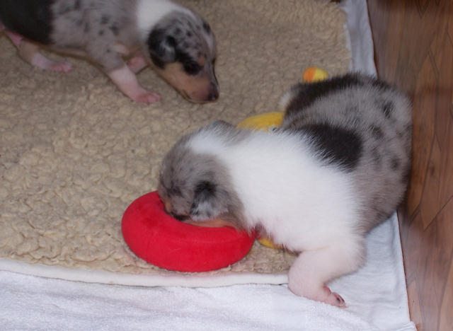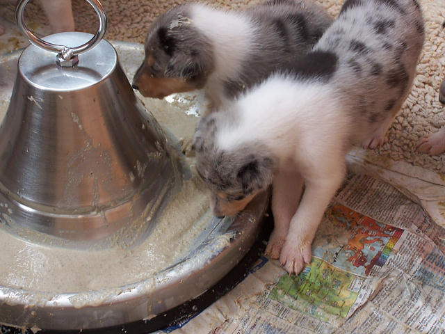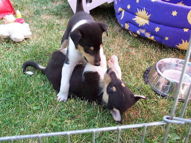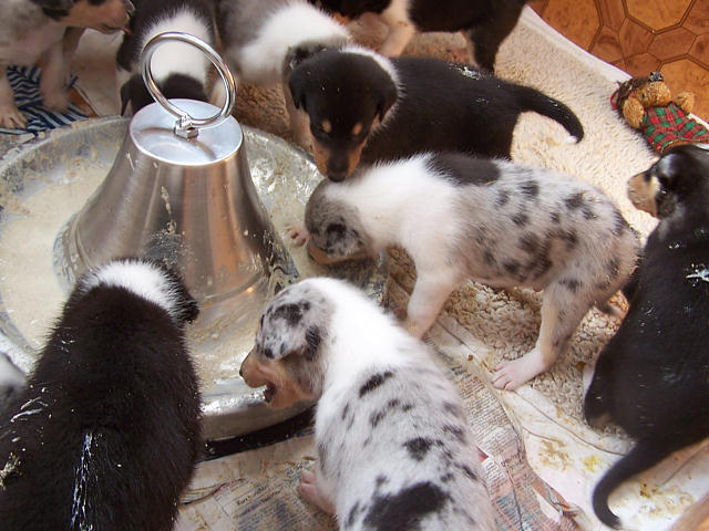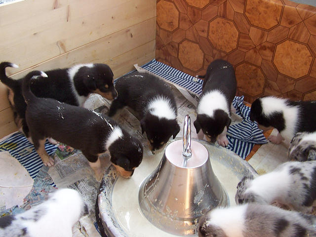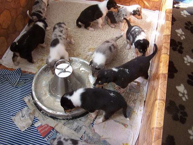 Die Zeit geht viel zu schnell vorbei. Die " Falcon´s " wachsen und wachsen. Jetzt sind sie schon 3 1/2 Wochen alt. Nun spielen sie schon miteinander und die Wurfkiste wird für die 10 Welpen zu klein. Die Welpen wollen so langsam ihre Umgebung erkunden und wir werden ihnen mehr Freiraum geben. Auch nehmen sie ihre Mahlzeit gemeinsam ein.