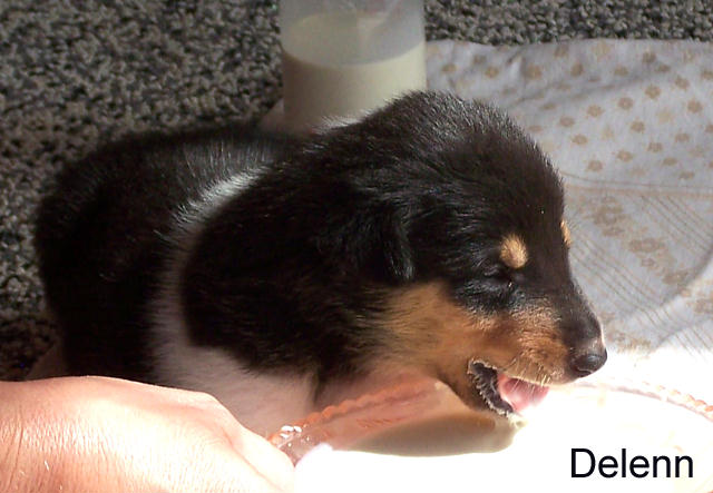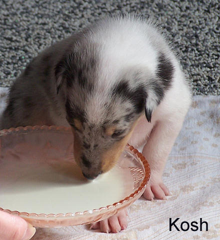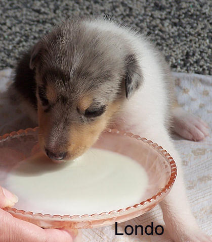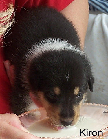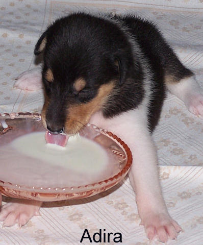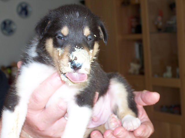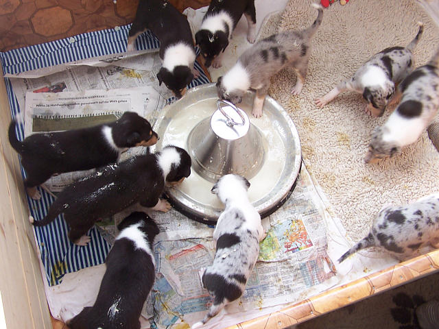 Da es zehn Welpen sind und wir Mabel etwas entlasten möchten, haben wir mit dem Zufüttern begonnen. Der erste Versuch selbstständig Welpenmilch aus einer Schale zu trinken.