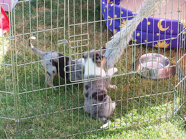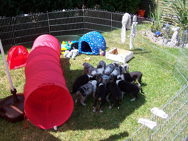 Das Wetter hat es zugelassen das die Falcon´s langsam mehr erleben. Rasen, Bällebad, Tunnel, kleines Zelt und vieles Mehr gibt es nun zu erforschen. Es macht den Welpen viel Spaß, draußen zu spielen und zu rennen. Auch gibt es das Futter draußen und wie man sieht haben die Falcon`s " anständig" fressen gelernt.